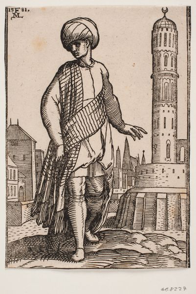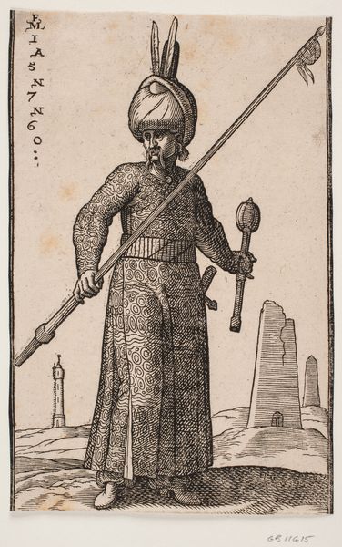 Melchior Lorck created this print of a standing soldier around 1576. Lorck, a Danish artist who traveled extensively, served in the court of Suleiman the Magnificent in Constantinople. This work reflects a fascination with the Ottoman Empire, a major political and cultural force in 16th-century Europe. The soldier’s elaborate attire is meticulously rendered. Note the flamboyant feathered headpiece, the patterned robe, and the bow and arrows, signifying his role as a warrior. The soldier’s pose, with his hand cocked at his waist, suggests a self-conscious display of power and masculinity. Lorck's travels allowed him to observe and document the diverse cultures he encountered, challenging the monolithic views of the “Orient” that were common at the time. However, we should still ask ourselves, to what extent does this image perpetuate stereotypes, and to what extent does it offer a nuanced portrayal of Ottoman identity? Consider how Lorck's personal experiences and artistic skill shape our understanding—and perhaps misunderstanding—of a world so different from his own.