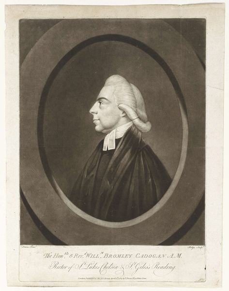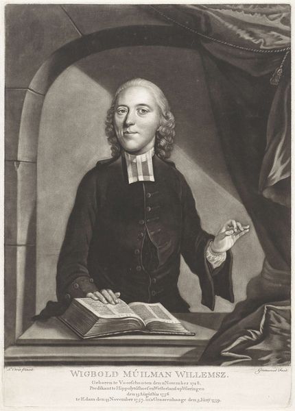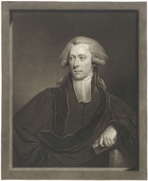 This is Charles Howard Hodges' portrait of Sebald Fulco Johannes Rau, created using mezzotint. The monochromatic palette emphasizes tonal contrasts, and the composition divides the frame between figure and setting. The subject, Rau, is rendered with careful gradations of light and shadow, lending him a lifelike presence. Hodges utilizes the mezzotint technique to produce rich textures, seen especially in the velvety appearance of Rau’s coat and the ornate details of the surrounding objects. The composition places Rau in a scholar’s setting, surrounded by books and writing implements, signifying intellectualism. The play of light across the surface of the print not only models form but also directs the viewer’s gaze, creating a sense of depth and atmosphere. It’s the subtle gradations of tone and texture in this mezzotint that bring the sitter to life, inviting us to contemplate the character and status of the sitter within his cultural milieu. This artwork presents not just a likeness, but an engagement with the very fabric of representation itself.