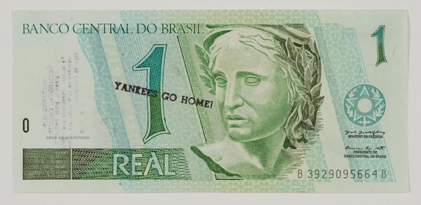 Meireles started this project during the military dictatorship in Brazil. In the face of strict state censorship he stamped messages calling for democracy and political freedom on banknotes and returned them into circulation. This work relates The Coca-Cola Project. The artist is happy for others to participate in this project, stamping their own messages on the banknotes of any country. For Meireles, the notes displayed here are only documentation. The work operates when the notes are used as currency. Gallery label, August 2020