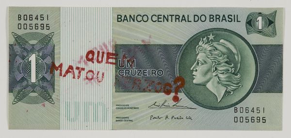 Curator: Let's discuss Cildo Meireles' "Insertions into Ideological Circuits 2: Banknote Project." It's a politically charged piece where Meireles stamped banknotes with questions and statements. Editor: It feels like a whispered scream. Seeing that question, “Quem matou Herzog?” [Who killed Herzog?] on a banal object like a banknote... it's chilling. Curator: The artwork directly confronts state violence and censorship during the Brazilian military dictatorship. Herzog, a journalist, was murdered by the regime, and this work circulates that forbidden question. Editor: Exactly! Money talks, right? But here, it shouts. It’s a clever subversion, turning currency into a tool of resistance, spreading truth where it’s least expected. Curator: It highlights the power of art to disrupt established narratives and engage with crucial socio-political issues. Editor: It’s a haunting reminder that even small acts of defiance can carry immense weight.