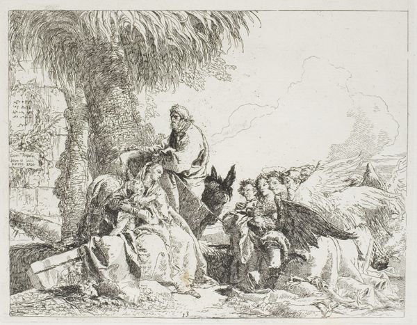 Editor: Here we have Giovanni Domenico Tiepolo's "The Holy Family Walking Along a City Wall," an etching from 1753. It’s quite a busy image, with a lot of figures and textures crammed onto a relatively small paper. How do you interpret this work? Curator: It’s fascinating to consider this print as an object produced for a specific market. Etchings like these were often made to be sold and collected. Think about the labour involved: the artist creating the image, the workshop reproducing it, and then its circulation through merchants. How does understanding its place within a system of production and consumption change how we view the image itself? Editor: That's a really interesting point! It does make me think about the sheer number of prints that must have been made. The artist becomes a kind of manufacturer, almost. I hadn't really considered the practical, commercial aspects. Curator: Exactly! And notice the materials. Paper was becoming more readily available, fostering printmaking’s spread. Etching itself is relatively accessible process compared to other forms of printmaking. Could its democratic qualities influence how stories were shared through the artwork? Editor: Yes! It's not just a divine scene, it's an object that can be distributed and reproduced, almost like...sharing the story more widely through a material means. Considering Tiepolo as someone deeply embedded in this material process, it changes everything. Curator: Precisely. It urges us to rethink traditional distinctions of 'high' and 'low' art. These prints engaged with popular culture through materials and methods and served many social strata, didn't they? Editor: Definitely, this perspective on production really reframes how I appreciate it. Thank you for pointing that out. Curator: My pleasure. It's important to remember the social context in the materials, the artistic process.