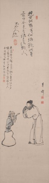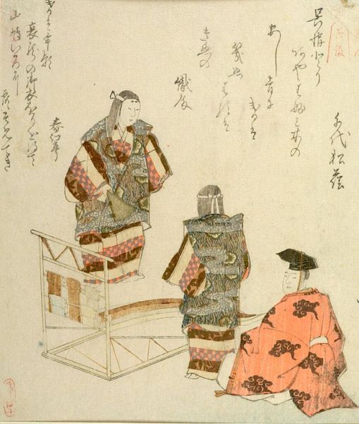Editor: Hokuba’s *Scene from a NÅ Play* is captivating. The robes, the expressions, and the text above—it all feels very performative and theatrical, like a staged moment. What can you tell me about the cultural context of this work? Curator: It’s intriguing, isn’t it? These prints, often commissioned by poetry clubs, weren’t just decorative; they served as vital documents of literary and theatrical culture. Consider how the artist positions the figures and incorporates text. Editor: So, it's about more than just the image itself? Curator: Absolutely! The print captures a social event, a merging of artistic practices. It’s a window into the cultural life of the time. Editor: Fascinating! It makes me appreciate the print on a much deeper level. Curator: Indeed. Understanding the context unlocks a richer appreciation for the artwork.