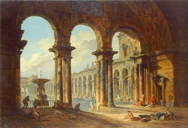 Editor: Okay, next up, we have Hubert Robert’s "The Landing Place," an oil on canvas painted in 1787. It strikes me as both grand and melancholic. The architecture is imposing, but also in a state of picturesque ruin. What do you see in this piece, its story maybe? Curator: You nailed it – a dance between grandeur and decay. For me, this painting is Robert daydreaming of Rome, even though he actually lived there for many years. Think about it: architecture wasn’t just background, it’s the main character, and it gets a certain… poetic license, let's say! He's arranging fragments, mixing realism with invention. Like memories – are yours perfectly accurate? Editor: Not at all, haha! More like… impressions. So, he's inventing this Roman space, how does that reflect the taste of his time? Curator: The late 18th century was infatuated with antiquity but saw it through rose-tinted glasses. Robert captured that yearning for a lost golden age. These ruins aren't just stones; they're emotional triggers. Look at those tiny figures... lost within such scale! Editor: Yes, that gives it a Romantic vibe for sure, and that play of light is so painterly… very dreamlike. Curator: Exactly! This controlled chaos, I find so refreshing. A nostalgic postcard from the past, sent to the future. He romanticizes his realities through architecture; almost like sketching freedom itself, with pigment and stone. Editor: I guess I understand now, the blend of reality and idealized fantasy makes it powerful. I appreciate the new perspective. Thanks. Curator: Absolutely! Every visit brings something fresh, that's the charm of these historical landscapes, they make you rethink what you previously thought was old and dead.