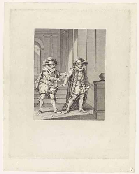 Editor: This is "Oranje geeft Bossu te Hoorn zijn zwaard terug, 1573" created in 1781 by Theodoor Koning, currently held at the Rijksmuseum. It looks like an engraving. I am struck by the rather generous mood, given its depiction of a historical event of surrender. What story do you think this artwork tells? Curator: The image certainly radiates a particular moment in history viewed through the lens of the late 18th century! What appears generous might be the Baroque inclination towards grand gestures and dramatic presentation – a common thread through historical depictions of the time. To me, the work encapsulates not just a surrender, but an idealized act of reconciliation or magnanimity, quite typical of how nations loved to view their leaders. What I find interesting is the interplay between the sharp lines of the engraving and the soft, almost theatrical postures of the figures. Notice how the architecture almost boxes in the moment, pushing our focus onto the exchange of the sword. Does that contrast strike you at all? Editor: It does, actually! It feels like that contrast draws more attention to the human drama playing out front and center. Curator: Precisely. And, isn’t there a certain irony that a moment of defeat is rendered with such… poise? It almost downplays the gritty realities of war. Perhaps that's why I read it as aspirational, a subtle nudge towards ideals of statesmanship. The engraver, Koning, wasn't just recording history, they were shaping it! Food for thought, wouldn’t you say? Editor: Absolutely. I hadn't considered how much the artist's perspective could reshape the historical narrative. Thanks for your insight!