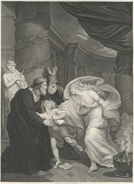 Curator: Here we have an intriguing work of unknown title by Robert Smirke, who lived from 1752 to 1845. It resides here at the Tate Collections. Editor: My first impression is one of a sombre, almost spectral atmosphere, conveyed through the predominantly brown palette and the ethereal figure floating above the scene. Curator: Indeed. Smirke, a figure steeped in the social and theatrical traditions of his time, often drew inspiration from literary narratives. This piece evokes the power dynamics inherent in representations of illness and the female form. Editor: The composition is quite striking. Note how the central grouping—the ailing figure and those attending—forms a horizontal plane, while the standing figures introduce verticality and lead the eye to the floating woman. Curator: The image offers an interesting perspective on gendered expectations and the control exerted over women's bodies during this historical period. The floating figure appears to be a projection of the central character’s desires or fears. Editor: I find myself drawn to the intricate web-like texture in the upper portion of the painting. It adds a layer of complexity to the otherwise muted tones, almost creating a symbolic veil. Curator: It’s a potent example of how art can embody the complicated social and philosophical currents of its day. Editor: It certainly offers a rich visual and intellectual experience for modern viewers.