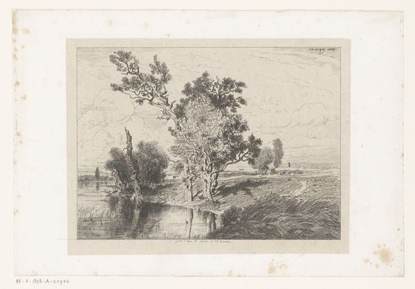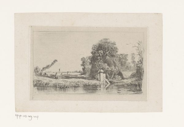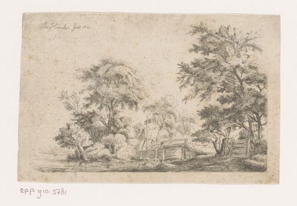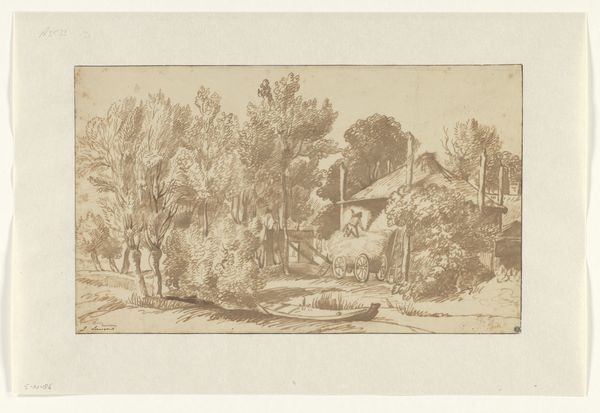 Curator: Welcome. We are standing before "Landschap met reizigers en vissers," a Dutch Golden Age landscape attributed to Nicolaes van Lijnhoven, dating from between 1620 and 1700. It’s an ink drawing on paper. Editor: It’s incredibly subtle; almost ghostly. There is such delicate layering and rendering that create a kind of faded pastoral calm – but with underlying socioeconomic implications for certain. Curator: Indeed. The artist uses fine, controlled lines to delineate the landscape elements. Notice the composition; a structured spatial organization that separates and unifies land, people, and sky, within which lies a series of intriguing binaries – a busy foreground opposed by a placid background, civilization juxtaposed to nature. It reflects Dutch formalism of that time. Editor: Binaries are present yes, but this juxtaposition can be deconstructed further. We’re not just talking about scenery, we’re looking at systems. This artwork serves as a mirror, reflecting the era’s colonial wealth juxtaposed with local everyday labor practices, revealing who had access to what kind of leisure. Look closely, we’re meant to. Curator: Consider too how van Lijnhoven directs the viewer's eye. He establishes the eye movement from a dark architecture structure in the far-left midground, drawing our gaze to the landscape unfolding towards a lighter open composition in the horizon. It's almost mathematical. Editor: The open composition is really the key. Look, who populates that part of the work. They are working-class people on the shore of the river while merchants leisurely enjoy nature or head somewhere beyond on horseback with carriages in tow. Even this seemingly peaceful setting points towards wealth disparities of the time. The ‘Golden Age’ wasn’t so golden for everyone. Curator: I do appreciate that your interpretation adds needed historical context. It allows for us to decode van Lijnhoven's representation, not only to see an idyllic scene, but one of stratified life during the rise of Dutch power. Editor: And for that recognition of nuance we become better observers of history as lived by all who came before. It allows us to draw parallels to issues affecting the global climate today. Thank you for expanding my insight through structure!