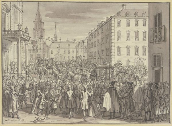 Editor: So, this engraving, "Attack on the Carriage of the Deputies of Dordrecht, 1786," made by Willem Kok, is incredibly chaotic. The eye doesn’t quite know where to settle with so much activity going on. What’s your initial read on it? Curator: The chaos, as you describe it, is key. Think about how an image like this serves not just as documentation, but as a carefully constructed narrative. The figures aren't merely bodies in space; each is a potential carrier of symbolic meaning related to social unrest and challenge to authority. Notice how the seemingly random gestures, the postures of attack and defense, echo classical compositions of conflict, reminding us that images are always speaking to the past even when they depict the present. What feelings does the imagery evoke? Editor: There's definitely a sense of agitation. People are falling, running – it’s really quite unsettling! Is that an intentional effect, do you think? Curator: Absolutely. The choice to depict such a scene with so much dynamic energy invites viewers to participate emotionally. The event itself—an attack on deputies—speaks to a moment of profound political division. But it's not just about recording an event, is it? The engraving itself becomes a powerful tool to shape public opinion. How might such a carefully crafted image sway viewers, then and now? Editor: It almost seems like propaganda, in a way, designed to elicit a strong reaction against the attackers, positioning the deputies as victims and potentially swaying people to one side. Curator: Precisely. The symbolism here—the attackers as disrupters of order, the deputies as representatives of rightful authority—plays into deeply ingrained cultural narratives about power, justice, and the rule of law. It shows the image wasn't just capturing an event but solidifying a particular interpretation of it. Editor: That’s fascinating, considering how much history can be shaped by the way we visualize it. Thank you for clarifying what to look for when reading such images. Curator: My pleasure. Always remember: Images speak; it is our task to understand their language.