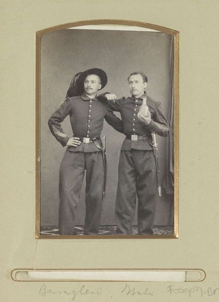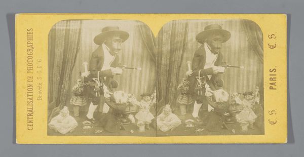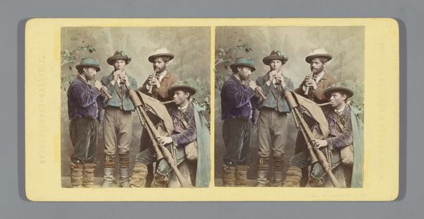 Florent Grau's photograph, "Two men playing wind instruments," presents us with a fascinating study in early photographic techniques. The sepia tones and the stereoscopic format immediately evoke a sense of nostalgia, framing the subjects within a tableau of a bygone era. The composition invites us to consider the structure of duplication and symmetry, typical of stereoscopic images, which were designed to create an illusion of depth. Here, the two men with their instruments are mirrored, creating a subtle interplay between reality and representation. The photograph's formal qualities are not merely aesthetic, but also reflect a broader cultural interest in perception and representation during the period of its making. The choice of subjects, their attire, and the instruments they play all point to a construction of identity, inviting ongoing interpretation and re-interpretation.
