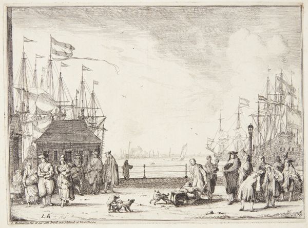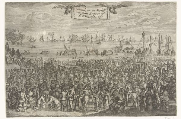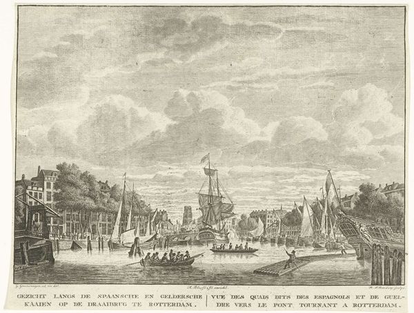 Editor: This engraving from 1832, titled "Lijkvaart van Jan van Speijk bij de Nieuwe Stadsherberg," depicts the funeral procession of Jan van Speijk. It's quite a detailed print, though the grayscale and fineness of the lines give it a somewhat somber mood, wouldn't you agree? I'm curious, what aspects of this scene particularly resonate with you? Curator: Oh, it's the very fabric of Dutch national identity woven in ink, isn’t it? This image—stiffly rendered, mind you—speaks volumes about how narratives solidify around tragic heroism. Van Speijk, a Lieutenant who chose self-destruction over surrender—boom! And here he is, floating into legend. Note the Dutch flags. A lot of them! Are they celebrating? Mourning? It's a bit much, almost performative. Editor: Performative, that's a great word for it! The flags, the crowds… it’s definitely a constructed image. But does that lessen the emotional impact for viewers at the time? Curator: Impact? Guaranteed. Consider the relatively recent loss of Belgium! National morale needed a shot in the arm, didn't it? An heroic narrative was born! Engravings like these? A cheap and reproducable patriotic pick-me-up. Look at the way the light catches the water and then those little boats… they evoke an almost classical sense of... *sigh* ...grandeur. Editor: So, the romanticism, then, is somewhat manufactured to boost morale? Curator: "Manufactured" is perhaps too strong but propaganda? Maybe. Regardless, isn't it interesting how historical events become curated memories? That’s what really fascinates me, and that this simple print has triggered us to talk about it… isn't that magic? Editor: Absolutely! It’s definitely made me rethink the relationship between art, history, and national identity. Thanks so much for your insights!