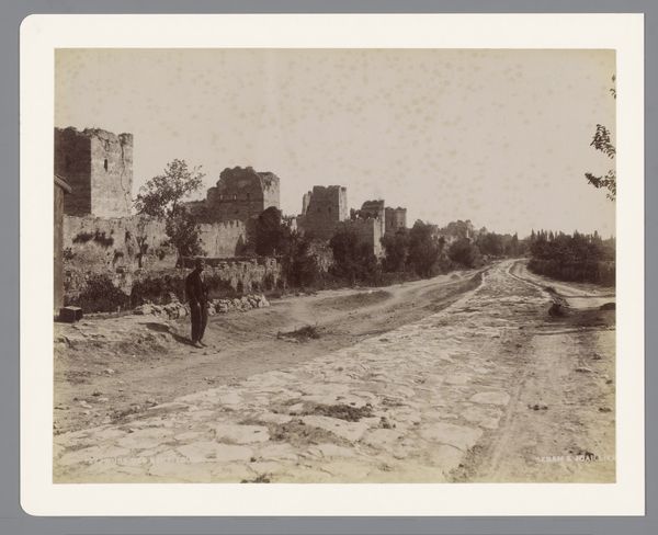 Curator: This albumen silver print, taken between 1857 and 1865 by Altobelli and Molins, depicts the Via Appia near Rome. Editor: What strikes me immediately is the dust and grit—you can almost feel it. The stark materiality of the ruins, the road itself... it’s very palpable, despite being a photograph. Curator: Indeed. The Via Appia, an ancient Roman road, here presented through the relatively new technology of photography. Think about the impact of widespread visual access to such historical sites and how it shifts the very understanding of classical antiquity. Editor: Exactly! It democratizes the experience. No longer just sketches and engravings for the elite. Here, we see the texture of the stone, the actual erosion… a physical record. The labor involved in constructing that road, the human impact over centuries—the photograph underscores that reality in a way paintings often gloss over. Curator: The ruined structures flanking the road highlight the rise and fall of empires. What was once a symbol of Roman power is presented in a state of decay, becoming an object of photographic capture for later consumption by tourists and historians alike. The politics of representing decline is key here. Editor: I am wondering about the production itself. The scale, the resolution possible for its time. It speaks to the technological innovations shaping art beyond painting and sculpture and questions the traditional art market. How does craft intersect with industry in these types of photographs, what types of labor was put on it, its conditions and accessibility? Curator: A relevant point to the discussions around cultural heritage! As viewers, are we mourning lost grandeur, or examining the continuous material transformations shaping our present? It is the layers of the story the photograph reveals, and conceals, which engage me. Editor: Absolutely. Looking at it more closely has also brought my focus toward laboring conditions that it presents, thank you for helping me go deep into this.