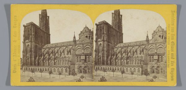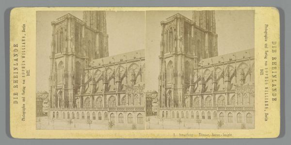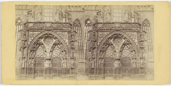 Editor: Here we have a photographic print from around 1860-1880, titled 'Toegangsportaal van de Kathedraal van Reims,' or Entrance Portal of the Reims Cathedral, by Jules Hippolyte Qu\u00e9val. It’s a striking cityscape. What stands out to you? Curator: What immediately captures my attention is not just the gothic architectural details, but the cultural context this image represents. Consider when this was created, in a time of immense social and political change across Europe. Photography was emerging as a means to document and celebrate national identity, wasn't it? Editor: Exactly! The rise of tourism, too, played a role, right? People wanted visual souvenirs of these grand historical sites. Curator: Precisely. How do you think the rise of photographic reproductions impacted the role of architecture and art within French society at that time? Was it simply a tool for documentation, or did it influence artistic movements themselves? Editor: I'd say it democratized access to art. People who couldn’t travel could still experience the grandeur of Gothic architecture through photography, fostering a sense of shared cultural heritage. Curator: That's insightful. Also, reflect on who this imagery served. Was it creating or reinforcing a specific national narrative? How did these images reinforce or challenge existing power structures within France? Editor: Hmmm. Good point! By focusing on these grandiose structures, did it perhaps gloss over other social realities or alternative narratives? The perspective makes you really think about what’s included…and what's left out. Thanks! Curator: Precisely. This photograph makes us think not just about art, but about its power to shape historical consciousness and national identity. Something I will also remember!