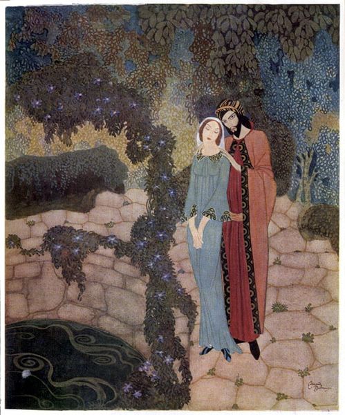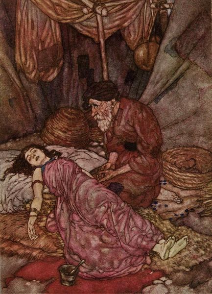Curator: Edmund Dulac, a prominent figure in early 20th-century illustration, created this piece titled "I will marry you - from Beauty and the Beast". The medium appears to be watercolor. Editor: It's dreamy. The stippled watercolor gives everything a hazy, almost ethereal quality. The palette is quite muted; even the beast's robes have a faded, antique feel. Curator: Dulac, along with other illustrators of his time like Arthur Rackham, significantly shaped the visual interpretation of fairy tales for a wide audience. Consider how these artists contributed to the Victorian era's romanticization of fantasy. Their art allowed narratives like Beauty and the Beast to become visual touchstones in popular culture. Editor: The composition strikes me. There's this strong diagonal line from the upper left of the tree down to the lower right where the beast lies, pulling the viewer's eye across the whole scene. The positioning suggests perhaps a point of reflection and decision for the beauty in this familiar narrative. Curator: Precisely! This work is interesting when examined in light of other contemporary interpretations of Beauty and the Beast. It is an important marker in our ongoing interpretation of stories told in new, unique ways, and Dulac uses visual language to convey a modern sense of how these classic works permeate and change in culture. Editor: Yes, you can certainly appreciate Dulac's rendering of the scene, which brings the essence of "Beauty and the Beast" to life. I was also curious about Dulac's use of pattern and texture here – it brings sophistication, doesn’t it? Look closely, and you will observe patterns on the beauty’s robes and turbans. Also, you will note the way he plays with negative space in the upper part of the picture with the dark tones, it provides a mystical sensibility, particularly within the star-like flecks placed throughout. Curator: His strategic blending of cultural narratives certainly gives the work a sense of universality that makes the piece stand out, as Dulac's "Beauty and the Beast" transcends a mere story and moves to a representation of modern interpretations of love, obligation, and, ultimately, acceptance. Editor: And thinking formally, there's a distinct layering effect here; the foreground seems almost to rise up to meet us, with a strong play of tone giving an intense intimacy to the picture that pulls us right into their moment.