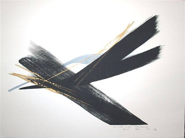 Toko Shinoda created "Sound" using lithography to explore the essence of Japanese calligraphy in a modern context. Born in 1913, Shinoda navigated the complex intersection of tradition and modernity that defined much of 20th-century Japanese art. Breaking from traditional calligraphy while honoring its spirit, Shinoda used abstract forms and bold brushstrokes. Note how the stark black shapes evoke a sense of dynamism and tension, punctuated by thin red lines. The layering and juxtaposition of these elements create a visual harmony that hints at a deeper, emotional resonance. Shinoda's work exists in the space between the seen and unseen, challenging us to consider the weight of cultural heritage and the individual's journey. How does this piece speak to the ways in which our identities are shaped by both the past and the present?