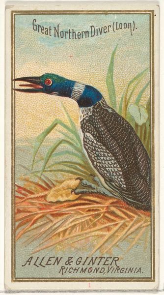 Editor: Here we have "Shoe-Bill," a colored-pencil print from 1889 made for Allen & Ginter cigarette packs. The bird itself is striking, but I'm also drawn to the way the background almost melts into it. How should we understand this work? Curator: Well, considering this was made for a cigarette brand, we have to examine it through the lens of commerce and consumption. These cards, mass-produced with colored pencils and printmaking techniques, were essentially marketing tools. How does the aesthetic of Ukiyo-e influence this commercial object? Editor: Ukiyo-e? Curator: Yes, that’s Japanese woodblock printing. Notice the flattened perspective, the focus on natural elements, and the decorative qualities, even the bold outlining of forms are evocative of Ukiyo-e. Does it challenge the hierarchy between high art and commercial design? Editor: I suppose so, but how does this all relate to the materiality? Curator: Think about the production process. Tobacco companies distributed these cards, embedding art within everyday life and addiction, utilizing cheap and mass-produced materials like cardstock and colored inks, thus questioning the role of labor. How does seeing this in a museum re-contextualize the labor practices implicit in it? Editor: I see. By appreciating the aesthetic, we are recognizing the cultural background that may be overshadowed by commerce. It's like we are examining a layered story within the artwork, not just an image. Curator: Exactly. And perhaps contemplating the larger framework of artistic appropriation and the societal context of art and capitalism. Editor: This definitely gives me a lot to think about!