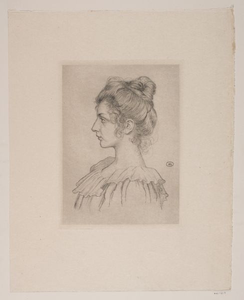 Editor: So, here we have "Portret van een jonge vrouw," or "Portrait of a Young Woman" by Philip Zilcken, made sometime between 1890 and 1913. It’s a pencil sketch, and I’m struck by how delicate and almost dreamlike it feels. What resonates with you when you look at this piece? Curator: It's interesting that you pick up on that dreamlike quality. I see this less as a portrait of a specific individual and more as an archetype. The young woman's gaze isn't directed at us; she's looking inwards, perhaps contemplating something just beyond our perception. It reminds me of depictions of muses or even figures in pre-Raphaelite paintings, who embodied specific virtues or ideas. Editor: That’s interesting. So, it’s not really about *her*, but what she represents? Curator: Exactly. Notice how the sketch lines are quite soft and undefined. Zilcken isn't giving us concrete details about her physical appearance; rather, he's using visual symbols – her downcast eyes, the simple adornment around her neck – to evoke a certain mood, a feeling of introspective innocence. In many ways the vagueness allows more to be represented. Does that shift how you perceive it at all? Editor: It does! It makes me think about how artists use symbols to create meaning. Like, is that adornment around her neck a symbol of restraint or simplicity? Curator: It could be either, or perhaps both. Think about the cultural context. What might a neck adornment signify in that era? Was it a common piece of jewellery? Does the looseness of its presence signify something about the sitter? The ambiguity is intentional; Zilcken is inviting us to project our own interpretations onto the image, drawing from our own cultural memory and understanding of these visual cues. Editor: I see what you mean. I had only considered my initial, gut reaction but now it seems like Zilcken’s piece prompts deeper reflection on how symbols speak to us across time. Curator: Precisely, and in a way, keeps the conversation alive.