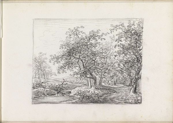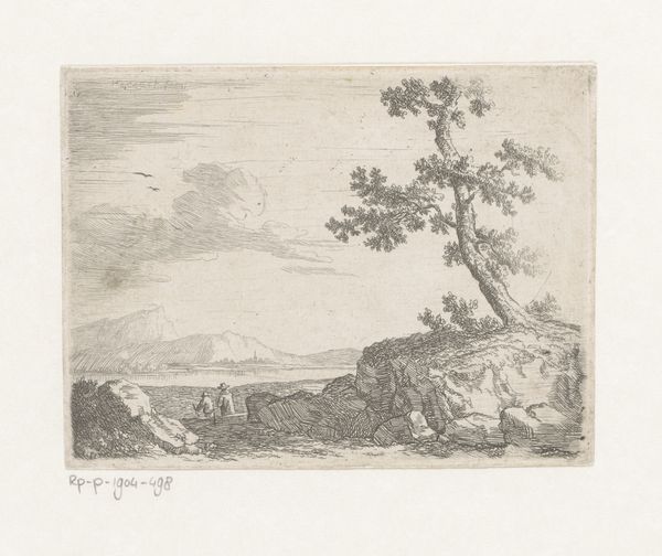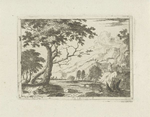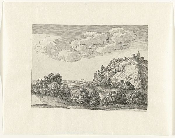 Curator: Wenceslaus Hollar created this etching, titled “Landscape with Wagon Pulled by Horses,” sometime between 1625 and 1677. It's currently held at the Rijksmuseum. What’s your initial take on this seemingly simple landscape? Editor: There’s a stillness, a contemplative quality to it. The monochrome palette emphasizes the fine details, and the slightly raised horizon and large trees give the image a lot of weight. It almost feels cinematic in its breadth despite being an etching. Curator: It’s interesting you mention its “cinematic” feel because it seems that Hollar's wider body of work reflected the socio-political disruptions of the 17th century in Europe. While the landscape appears pastoral, we must think about land use, enclosures, and the labor connected to rural settings at that time. These sorts of works acted as a visual shorthand to comment on the hierarchies of wealth and power, where landowners and workers were negotiating social identities. Editor: Yes, and you see a little evidence of it in this one small image. You're drawn to the details of the horses and covered wagon traveling towards the hills, likely going from or toward larger market towns. What story do these workers hold? Curator: Exactly. Further contextualizing this landscape against, say, his cityscapes, could also highlight the tensions between urbanity and nature, which were points of anxiety for expanding capitalist societies. Editor: Do you think he intended for viewers to read these layers of social critique within what otherwise looks like an understated depiction of nature? Or do we burden the image with contemporary readings? Curator: That's the question, isn't it? Maybe both things are simultaneously true. Hollar gives us a picturesque scene, expertly rendered, but it also invites us to ask whose stories aren't being shown in the idyll. We can bring our theoretical lenses and find new narratives embedded within the artwork's surface. Editor: Precisely. By understanding the nuances of their time, artists unintentionally embed complexities that subsequent audiences can uncover through their own contextual frameworks. It is beautiful when the artworks become a nexus for thinking critically about history and our place within its progression. Curator: Absolutely. Each viewing can be an excavation of shared, or forgotten, histories. Editor: An intriguing work. Thanks for sharing your perspective.