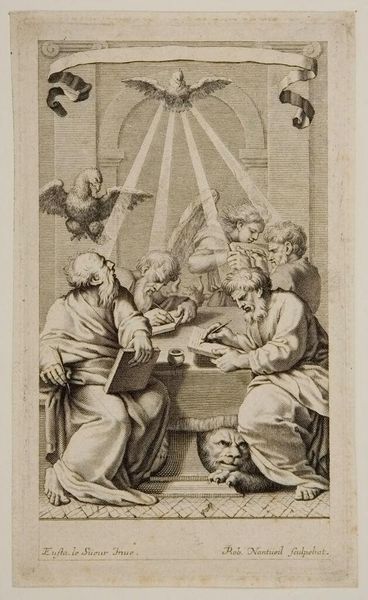 Editor: Here we have Cornelis Cort's "The Last Supper," a print held at the Harvard Art Museums. The architectural setting feels grand, almost theatrical. What's your read on its historical context and public reception? Curator: This print reflects the Counter-Reformation's emphasis on the Eucharist and the Church's authority. How would viewers at the time have interpreted the detailed setting and the expressive gestures of the apostles? The architecture is designed to impress. Editor: It definitely feels like a statement of power. I see the scene of Jesus washing the feet of the apostles at the top of the stairs. Curator: Exactly. The artist connects the Eucharist with service. Cort's work shows how religious imagery was deployed to reinforce specific doctrines and social hierarchies, particularly through the public display of such prints. Editor: I hadn't considered the political implications of religious art so directly. It's more than just a depiction, it's a statement. Curator: Precisely! These prints served as visual arguments in a time of intense religious and political upheaval.