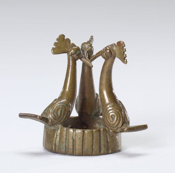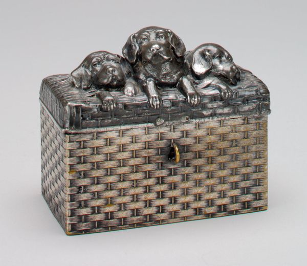 Editor: Right, next up we have the -Dog Tray Bank- mechanical bank from around 1880, attributed to Louis Kyser. It’s made of metal and what looks like found objects assembled together. It strikes me as both charming and a little unsettling – this worn down metal look against such a playful subject matter. What sort of symbolism can we draw out of something like this? Curator: The wear itself speaks volumes. Imagine the countless coins deposited, each act imbuing the object with memory. Notice the dog: fidelity, loyalty, but here, made mechanical, almost subservient to capital. Is that tray offered willingly, or is something else implied? Consider the grid-like structure— a cage or a stylized rendering of…security? Editor: That's a fantastic point about the grid. The security aspect never occurred to me. So, are you suggesting the image of the dog becomes intertwined with deeper societal ideas about labor and safety? Curator: Precisely! The imagery invites questions about how we condition our own desires, especially for something as fundamental as financial security. What does this "faithful" acquisition and accumulation ultimately symbolize to its user, its owner? Editor: I suppose a child using it might not pick up on those more complex ideas. It makes me consider how our individual contexts can completely shift the narrative behind such a symbolic, albeit functional, item. Curator: Exactly. An object like this then speaks to the multi-layered dimensions of visual communication – evolving in memory from a child's simple delight to potentially quite complicated messages as social, economic, and other conditions evolve across history. It’s rather fascinating. Editor: I agree, I'll certainly never look at another antique bank the same way again.