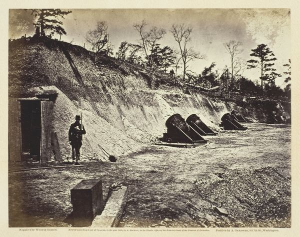Curator: This photograph, taken by Eadweard Muybridge in 1877, is titled "Acajutla". It's a gelatin-silver print, typical of his landscape work. Editor: There's a distinct stillness to it, almost melancholic. The sharp, receding lines of those trenches cut a deep path right through the heart of the composition. It's all sepia tones and quiet tension. Curator: Indeed, the composition directs our gaze, doesn't it? Muybridge was commissioned to document landscapes throughout Central America, capturing the environment and infrastructure projects primarily financed by American investors. Consider this within the context of 19th-century imperialism. Editor: That context certainly shifts the reading. I was initially drawn to the formal elements – the way the buildings are framed by the landscape, the subtle play of light and shadow on their facades. But understanding the socio-political motives…it undeniably adds another layer of complexity. The trenches now seem more ominous, perhaps alluding to exploited resources. Curator: Exactly. Muybridge's work became instrumental in shaping perceptions of these regions, subtly promoting expansionist agendas. The photographs, while seemingly objective records, also served very specific political and economic purposes. It is essential to always question how and why these landscapes were presented. Editor: Yet, the photograph itself maintains an artistic integrity. Look at the depth of field, the almost clinical precision. It's both documentary and artful. Perhaps it inadvertently reveals a sense of displacement? Those carefully placed buildings still appear stark against a vast, untouched landscape. Curator: The perspective provides both objective distance, which aligned with photographic conventions, but the perspective also shows an imposition on the land. As photography democratized image making, it shaped social consciousness. Editor: Seeing how a formal reading interacts with that background adds real insight to its lasting relevance. It highlights art's ability to transcend while embedding ideology. Curator: Precisely, this image of "Acajutla," offers a potent commentary on the photographer's, the financiers’, and our roles as we look at this image even today.