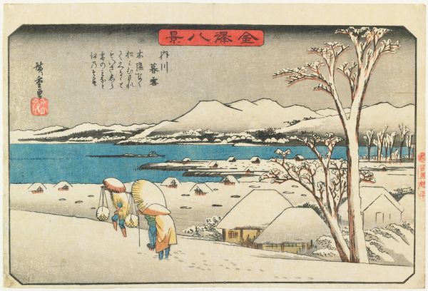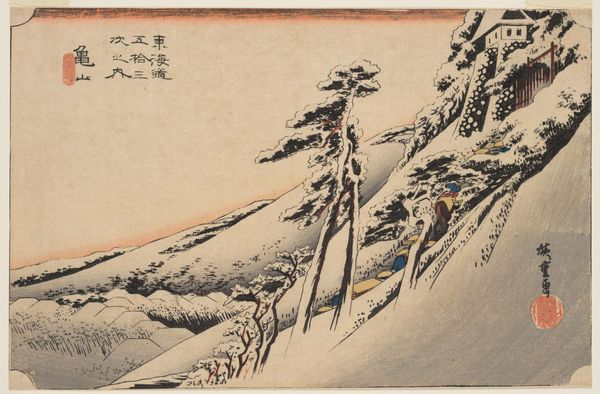 Keisai Eisen created this woodblock print, "No. 15, Itahana," as part of his series depicting the sixty-nine stations of the Kisokaidō Road. At first glance, the scene is dominated by the starkness of winter, with snow-laden trees and travelers braving the cold. The bent, snow-covered pine trees symbolize resilience and endurance, echoing ancient East Asian art motifs. In Chinese painting, the pine is celebrated for its ability to withstand harsh conditions, a testament to longevity and steadfastness. We can see a similar invocation of nature's strength echoed in European Romantic paintings, where gnarled oaks stand as symbols of defiance against the elements. Consider the lonely figures making their way along the road, their hunched postures suggesting not just physical cold, but also a deeper emotional isolation. This feeling of solitude, so vividly portrayed, reverberates through the ages, reminding us of our own human struggles against the indifferent forces of nature and time. The image invites us to reflect on the eternal dance between humanity and the world around us.