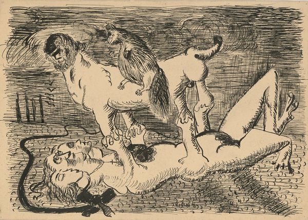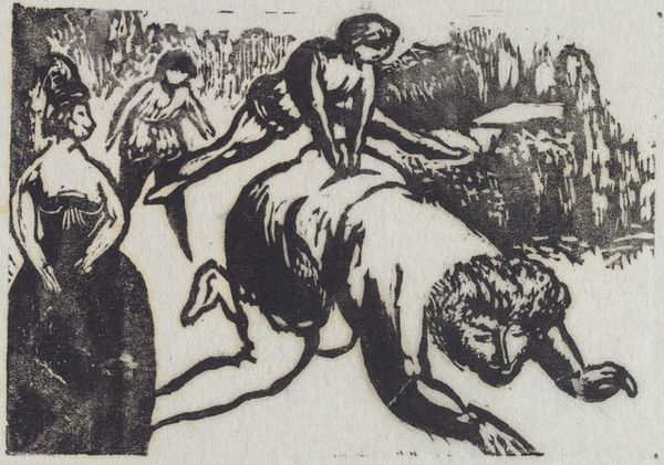 Curator: Right, so here we have "Gargantua: Chapter XXII - "Les balancoirs"," a woodcut print made by Bernard Reder in 1942. What do you make of it? Editor: Immediately, there's this sense of a strange revelry... it’s almost feverish, a very physical intensity emphasized by the starkness of the woodcut. And what scale are we talking here? It feels intimate, personal. Curator: Yes, the print gives it a unique rawness and it being a small woodcut underscores that handmade quality, defying the precision often prized in more refined printmaking techniques. The labor is evident, isn't it? Reder seems more interested in capturing a vital, immediate energy than a polished finish. Editor: Absolutely. Those deep blacks are like an embrace. I notice the landscape details and human figures are almost aggressively carved out. This reminds me of a communal labor, where each figure contributes in their own unique way to complete the community. Curator: Yes, I agree! Those stark contrasts really grab you, don't they? He's got these figures on swings and this grotesque figure looming in the foreground—a fascinating choice! Are we meant to feel a kind of anxiety or judgment or an invitation, really? The story could be ours. It seems less about showing and more about evoking…the sheer pleasure, even ecstasy, of unbridled physicality. Editor: Given its 1942 production date, amidst war, there's almost a transgressive element to its unabashed sensuality. Was Reder seeking liberation through the body by looking at Gargantua? And let’s consider the material conditions; paper itself was likely a precious commodity. These limitations actually emphasize the value and meaning that he created within a culture deeply mired in materialism. Curator: That context really unlocks a lot! Maybe there’s also an act of defiance here, a scream for liberation or self-discovery? The very act of swinging—abandoning oneself to momentum—feels intensely poignant given those historical restrictions and cultural impositions. Editor: Definitely. It urges us to see beyond just form, and material to also include the social and historical narratives. Reder's art becomes not just a beautiful rendering of bodies but a tangible relic deeply intertwined with both scarcity and desire. Curator: So true. Well, I think looking at it together has reminded me that sometimes, the rawest expressions are often the most profound statements! Editor: Indeed, especially when considering art as both the object itself and as an act of making, pushing back on norms that want us only as consumers of perfect images and instead demands we remember a material process.