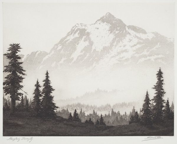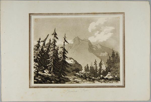 Editor: This is "Pine Trees in the Mountains," an etching by John Robert Cozens, created in 1789. I find the scene so serene, almost melancholy in its quiet grandeur. What do you see in this work, particularly considering its historical context? Curator: Serenity, yes, but perhaps also a subtle critique. Consider that Cozens was working during a time of immense social upheaval, the dawn of revolutions. This idealized, sublime landscape could be interpreted as a counterpoint to the rapidly industrializing world, a yearning for an unspoiled, pre-industrial past. How does the vastness of nature, dwarfing any human presence, speak to notions of power, or perhaps powerlessness? Editor: That’s fascinating. So, the absence of people isn't just aesthetic; it’s a statement? Is Cozens suggesting a kind of… resistance to the societal changes of his time? Curator: Precisely. Think about the philosophical underpinnings of Romanticism: a rejection of Enlightenment rationalism, an emphasis on emotion and the individual experience within the natural world. These mountains, these enduring trees – they symbolize something permanent and authentic, resisting the fleeting, often destructive forces of human progress. Consider, too, how landscape art often served the interests of the powerful. Does Cozens disrupt this by creating a space where that power feels, not absent exactly, but defused, less potent? Editor: That adds so much depth. I was only seeing the pretty picture, but it’s actually a quiet rebellion against the changing world! I'll never look at a landscape the same way. Curator: Indeed, art rarely exists in a vacuum. By exploring the sociopolitical and philosophical climate surrounding a work, we uncover its hidden voices and begin to see its complex role in the narratives of its time.