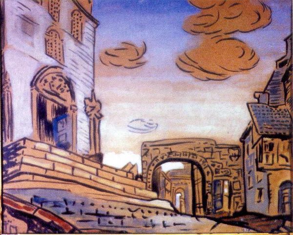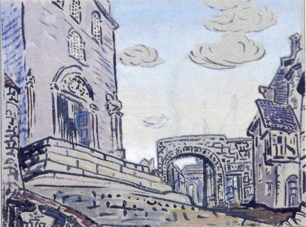 Editor: So this is Nicholas Roerich’s “City” from 1907, made with tempera on canvas. The cool blues give it this almost dreamlike quality, and yet there's a sense of something imposing. How do you interpret this work? Curator: Roerich's "City" is less a literal depiction and more a symbolic rendering of societal structures and perhaps their impending decline. Painted in 1907, during a period of significant social upheaval in Russia, the monochrome palette could represent a society struggling for clarity, with red hinting at the rising revolutionary fervor. What power dynamics do you think Roerich tries to depict through architecture in decline? Editor: Power dynamics through architecture... The buildings are imposing but also crumbling, like authority that's losing its grip. The use of perspective feels like you're looking up at these huge structures, making them seem dominant, but that also might point at some hidden vulnerability. Curator: Exactly! And let’s think about why he may have decided to go with the medium of tempera instead of oil, for example. The quick-drying, matte finish may suggest a desire to capture fleeting moments of societal transformation, or could tempera as a "traditional" medium be meant to draw connections between past and present societal concerns? Editor: That's interesting, I hadn't thought of that. It really contextualizes the work in terms of social anxiety, and in relationship to Roerich himself, right? Curator: Precisely. By intertwining aesthetic choices with societal reflections, Roerich urges us to contemplate not only the surface of the artwork but also its intricate connection to broader socio-political contexts, thus promoting a more comprehensive and nuanced appreciation. What has caught your attention most in the conversation? Editor: I think recognizing that the artist's choices are almost like coded messages reflecting their specific political moment is such a helpful realization.