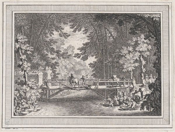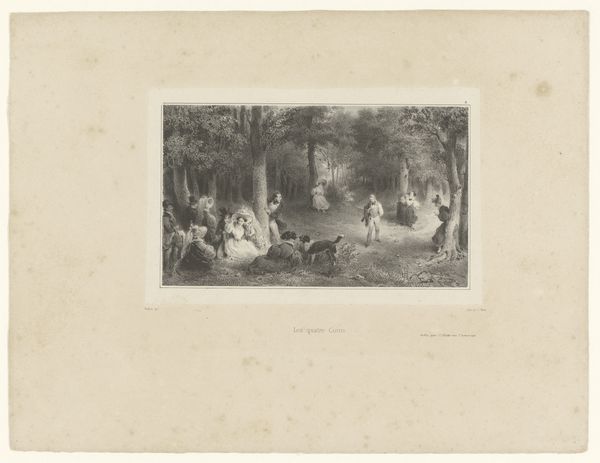 Winslow Homer's "A Picnic By Land" is a detailed engraving, showcasing a woodland gathering rendered in intricate lines and textures. The composition, bustling with figures, invites the eye to meander through the scene. The print presents a complex interplay between nature and society. Look at how the trees, rendered with delicate strokes, frame the clustered groups of picnickers, emphasizing the structured arrangement of the scene. The artist uses line to create texture and depth, inviting contemplation on how humans interact with their environment. The semiotic structure here suggests a commentary on social rituals within nature. The act of picnicking itself signifies an imposition of societal norms onto the landscape, creating a staged interaction. Through the interplay of dark and light, Homer sets up a system of signs and symbols which prompt us to question the constructedness of leisure and its relation to nature. The artwork serves as an entry point into a broader discourse on the representation of space, and the semiotics of social interaction.