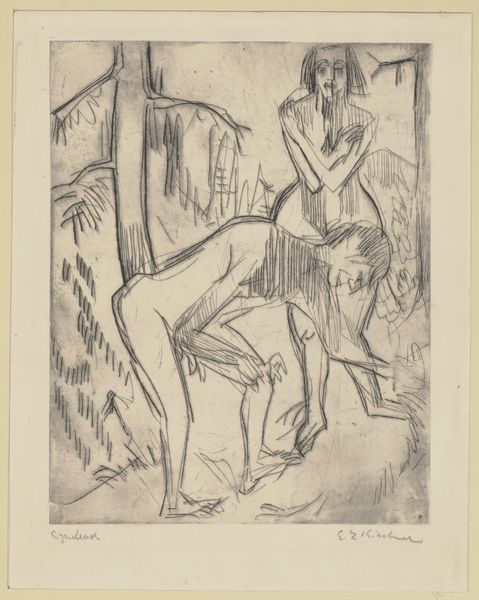 Editor: This is "Zwei Frauen, sich abtrocknend" – "Two Women Drying Themselves" – a chalk drawing from around 1924 by Ernst Ludwig Kirchner, housed at the Städel Museum. The rapid lines give it a very intimate, almost voyeuristic feel. What strikes you when you look at this? Curator: The beauty of this drawing lies in the dichotomy it presents. While the subject seems casual, almost mundane – the act of drying oneself – the imagery evokes deeper symbolic resonance. Consider the motif of bathing. Throughout history, water has been associated with cleansing, both physically and spiritually. Editor: That's interesting! I hadn't thought about the spiritual aspect. Curator: And observe how Kirchner uses line and form. The sketchy quality adds an emotional immediacy, right? The Expressionists often did. But look at the lines he *doesn't* draw! The incomplete forms might hint at the fragility and transience of human existence, the fleeting nature of a private moment. Do you agree? Editor: Yes, I do. The unfinished quality contributes to that sense of impermanence, like capturing a moment that will be gone in an instant. Curator: Furthermore, consider the socio-cultural context. Post-World War I Germany witnessed immense social and political upheaval. Kirchner's exploration of the human form, raw and vulnerable, might be a subtle commentary on the changing societal norms, a rebellion against conventional representations of beauty. Editor: I see your point. So the image, seemingly simple, is layered with meanings. Curator: Precisely. Art often functions as a mirror reflecting both the personal and the collective consciousness. Exploring these symbols reveals cultural memory. What began as a simple rendering unveils a much larger cultural narrative. Editor: I’ll definitely look at other figurative artworks with those aspects in mind. Thanks so much for sharing your insight. Curator: My pleasure. Every artwork is an invitation to delve deeper.