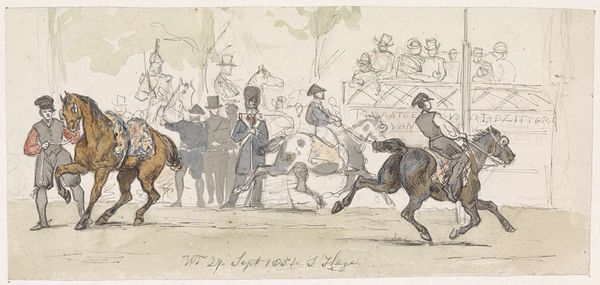 Editor: Here we have "Samenspraak tussen Kees den Boer en de landheer," which translates to "Conversation between Kees the farmer and the landlord." It's an anonymous watercolor and pen painting from between 1710 and 1740, currently held at the Rijksmuseum. It's fascinating how detailed the figures in the background are, yet they are small. What is your interpretation of this piece? Curator: What strikes me immediately is the emphasis on materials and class structure through the details. The very fact that this is rendered in watercolor and pen, mediums readily available, speaks to a different kind of art production than, say, large-scale oil paintings commissioned by the wealthy elite. Editor: I see your point. How does that tie into the subject matter? Curator: Consider the "conversation" itself. We have the landlord and the farmer—staged almost like actors, contrasted with the blurred production in the back. The landlord’s fine clothing and leisurely stance denote privilege enabled by labor that probably occurred because of resources that were obtained because of the weapon lying on the ground in between the landlord and farmer. Editor: It's like the artwork itself embodies that tension between the landowner’s privilege and the farmer's labor. The landlord isn't rendered realistically, suggesting an uneven representation, perhaps poking fun. Curator: Precisely! The caricature becomes a material critique in itself. It makes us consider the consumption of images and the power dynamics inherent in who gets represented, and how. Editor: That gives me a new perspective. I hadn’t considered how the *making* of the art—the cheap materials and medium itself—commented on the social dynamic represented in the scene. Curator: Indeed. And by engaging with these aspects, we’re challenging conventional notions of art and its place within the broader societal fabric of consumption and labor. Editor: I’ll definitely look at art differently now, with a closer eye to the production and material circumstances.