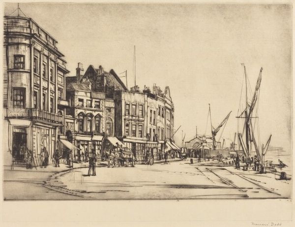 This is "Old Houses, Greenock" by David Young Cameron. In this etching, notice how the buildings are rendered with a rich tapestry of lines and shading, creating a sense of depth and texture. The detailed facade of each building reflects the artist's interest in architectural form, while the ripples in the water introduce a dynamic element that activates the scene. Cameron employs a sophisticated use of perspective, drawing the eye along the river to the buildings, which dominate the composition. The reflections in the water create a semiotic interplay between the real and the mirrored, inviting us to question the stability of what we see. The lines serve not just to depict but also to express a particular mood, where the precision of the architecture contrasts with the fluidity of the water. In viewing this work, consider how Cameron uses line and form to construct an environment that is both familiar and complex. The artist offers an engaging visual and intellectual encounter.