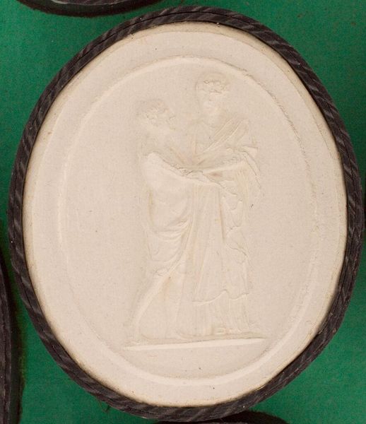 Editor: This is Settari's "Cupid Stung by a Bee, after Thorwaldsen," a tiny medallion at the Harvard Art Museums. It feels so delicate and classic. What symbolic weight does this scene carry? Curator: The bee sting, a small event, becomes a symbol of life's unexpected pains. Notice how Cupid seeks comfort from Venus. It's a universal image of vulnerability and the need for maternal solace, reflecting archetypal bonds. Doesn’t the intimate scale intensify this emotional impact, drawing us into a private moment of shared pain? Editor: I see it now – a miniature drama about big feelings. Thanks for pointing that out! Curator: And I see it with new eyes as well, by sharing thoughts together.