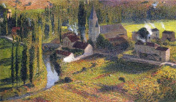 Curator: "Milton, East Knoyle," a landscape painting executed in 1916 by Lucien Pissarro. What are your initial thoughts on this canvas? Editor: There’s an immediate sense of quietude that washes over me. The dabs of color give it such a comforting presence, like a hazy memory. Curator: The application of oil paint certainly dictates much of the reading. Observe the broken color and brushstrokes—hallmarks of Pissarro’s dedication to Impressionist techniques. The materiality speaks volumes. Editor: Indeed. Pissarro painted this scene en plein air, didn't he? I always find it fascinating how these idyllic landscapes offered an escape during the turmoil of World War I. It makes one consider art's function as a place of respite and peace. Curator: Exactly. It reflects Pissarro's position as a member of a family committed to left-wing political action and to examining the impact of the modern on the natural landscape. One notes how he utilizes color to convey depth and spatial relations instead of formal lines. See how this lack of concrete definition, lends itself to feeling rather tranquil. Editor: Yes, the brushstrokes blend reality and emotion. Also the small houses, seemingly nestled comfortably within the land...there’s such an emphasis on how humans coexist with nature here. Considering that the scene dates to the period of intense social upheaval of World War I makes me wonder if there is more here than meets the eye. The subtle rendering of reality allows for interpretation. Curator: Interesting to note. Pissarro, having exhibited with the London Group and the New English Art Club at the time, would be aware of their respective aims. One sees in this artwork that they combine, emphasizing both formal experimentation while staying dedicated to accessible subject matter. Editor: The use of the earthy palette underscores his connection to the environment and I also feel invited in—the way the path leads your eye toward the houses, creating an immersive and almost intimate relationship. Overall, a compelling work, charged with both aesthetic intention and possible context. Curator: Agreed. The artist's hand and intellectual approach converge into a compelling statement through simple composition and familiar shapes. It's certainly a masterclass in conveying space through color. Editor: An apt demonstration of how social realities leave their impressions even on landscape art, transforming nature into more than meets the eye.