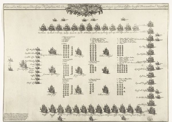 Bastiaen Stopendael created this print depicting the fleet formation of William III's voyage to England in 1688. The immediate impression is one of rigorous order. Etched lines meticulously arrange numerous ships into a grid-like composition on a horizontal plane. The ships diminish in size toward the horizon, creating a sense of depth. The artwork functions as a visual representation of power, organization, and control. The grid-like structure symbolizes the systematization of naval power, reflecting an era of burgeoning empire. The even distribution of ships suggests a unified front, which projects an image of consolidated authority and military might. The print not only documents a historical event but also embodies an ideology of order and control. Through its careful composition and systematic representation, the print emphasizes the imposing power and calculated nature of William III's enterprise. Its formal qualities underscore the larger political and strategic implications of this historical naval formation.