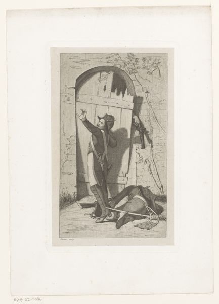 This lithograph, made by Adolph Kittendorff, is part of a series of images designed for young children. Here we observe a dead dog. It lies prone and lifeless, while a man stands nearby, head bowed in sorrow, a walking stick his only companion. The dog is one of humanity's oldest companions, a symbol of loyalty and fidelity. Here, its death elicits a profound sense of loss, tapping into a primal fear of mortality. Death, ever-present, finds its echo in countless works across time. Consider the ancient Egyptian depictions of Anubis, the jackal-headed god guiding souls to the afterlife, or the ever-watchful Cerberus, guardian of the underworld in Greek mythology. These figures reflect humanity’s perpetual attempt to understand death. The grief mirrored in the man’s posture is a reflection of this deeply-felt loss, reminding us that death's sting is a universal experience. This cyclical return of symbols touches something profound in the human psyche.