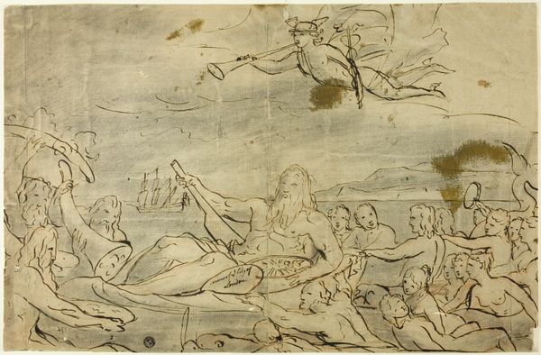 Curator: Nicolai Abildgaard's drawing, likely created sometime between 1743 and 1809, is rendered in ink on paper. Titled "Figurstudier. Liggende mand der rækker armene ud mod svævende kvinde"—or "Figure Studies: A Reclining Man Reaching for a Floating Woman"—it is held at the SMK, the Statens Museum for Kunst. Editor: My initial impression? A yearning. There's such a fragility to those thin, searching lines—especially the man reaching. He looks both desperate and reverent. It feels incomplete, like a moment caught between breaths. Curator: Incompleteness is a characteristic of many Romantic sketches and studies like this. There is something about the dynamic interplay between male and female figures, very present in Romantic art and thinking. He reaches, she descends or hovers. The implied narratives here touch upon familiar historical painting themes. The romantic period took on those themes using symbolism, intense emotions, and the human drama inherent in historical events. Editor: The draped figure definitely gives a sense of the dramatic—almost theatrical! The way the ink defines the heavy folds, she's both substantial and ethereal, grounded and otherworldly. Is she a muse, perhaps? Or maybe even death beckoning? Curator: She may be both. As this work’s subtitle at the bottom says, "Why weepest thou, daughter of Arno?". There seems to be some ambiguity around whether Abildgaard’s figure studies depict a specific narrative from Virgil's Aeneid—the tale of Camilla and her supernatural encounter on the banks of the Arno river. It could be about loss, destiny, but even rebirth... Editor: That context makes it even more haunting! Thinking about it in the light of those mythological elements, what I initially perceived as yearning now transforms into something more like fateful inevitability. You're right, this is something profound about human drama, destiny and yearning. Curator: These sketches reveal a constant process in human thinking, how stories change us and influence what is and can be. This piece, full of contrasts, speaks volumes about romantic longing. Editor: It leaves me contemplating our place within the grand tapestry of narratives that shape our lives. It’s an invitation to our own, modern self-mythologizing.