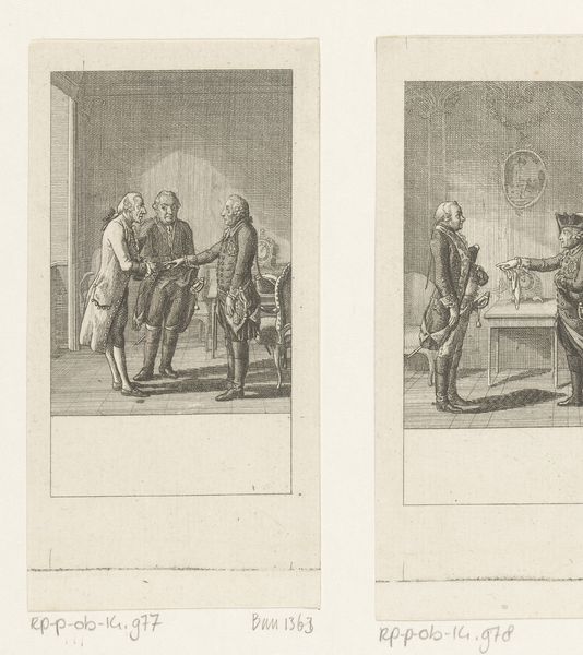 Daniel Nikolaus Chodowiecki created this etching, "Miller verdedigt zijn gezin tegenover de president," a title which translates to "Miller Defending His Family to the President," sometime in the 18th century. Chodowiecki lived through the Enlightenment, a period that championed reason and individualism. His works often explored the daily lives and moral dilemmas of ordinary people. Here, we see a scene charged with tension. A miller, presumably of modest means, confronts a figure of authority, the President, possibly advocating for his family. The image raises compelling questions about class and power dynamics. The miller's stance suggests courage but also vulnerability, as he dares to challenge the established order. This piece reflects the era’s shifting attitudes towards social justice and individual rights, resonating with contemporary discussions about equity and representation. It's a stark reminder of the personal courage required to challenge authority.