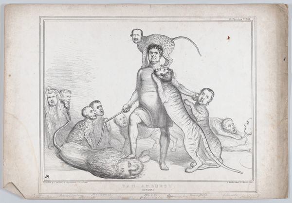 Curator: This is a lithograph by Honoré Daumier, a biting commentary titled "Well, mate, wouldn't you say this is better than o-o-opium? Just you wait, I'll ci-i-i-i-ivilize you!" Editor: My initial reaction is discomfort. The caricatures are grotesque, the energy aggressive, and the message...well, it seems like a blatant justification for colonial exploitation. Curator: Indeed. Daumier, working in 19th-century France, used lithography extensively to critique the bourgeoisie and their policies. The print reveals a pointed commentary on the Opium Wars. Note the contrast in textures. Editor: Precisely, and the positioning. The exaggerated features reduce complex sociopolitical dynamics to a crude power play. The pagoda in the background, a symbol of Chinese culture, feels almost mocked. It is a portrait of dehumanization. Curator: The materiality of lithography itself—the accessibility of print—allowed for wider dissemination of these ideas, shaping public opinion. Editor: Shaping it through propaganda, though. The print acts as an artifact of the moment, revealing the inherent racism intertwined with ideas of progress and civilization. It's a disturbing piece. Curator: Disturbing, yes, but also vital in understanding the visual culture that fueled colonial ambition. Editor: Absolutely. It reminds us that art doesn't just reflect society; it actively participates in shaping it, sometimes in deeply problematic ways.