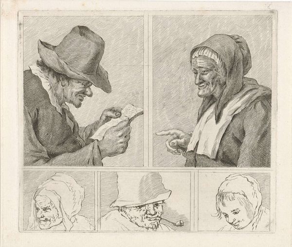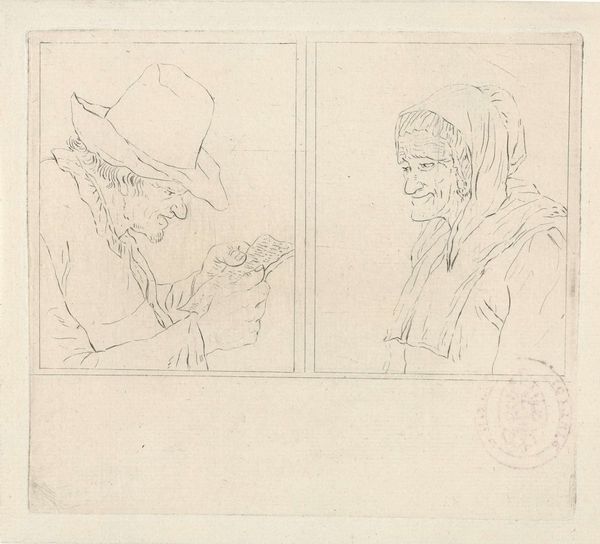 Curator: Before us is a drawing from between 1768 and 1796 titled "Lezende man en oude vrouw," currently held in the Rijksmuseum. The artist behind it is Pieter de Mare, working with pen and pencil. Editor: What strikes me immediately is the stark division of the composition, those twin portrait boxes isolating the subjects in this genre-painting with all that careful, deliberate line work, almost scientific in its detachment. Curator: Yes, a dual study it is, and while rendered with objective realism, the figures tap into potent cultural archetypes. We see a man engrossed in a letter and an older woman beside him, each framed in their world and the implied stories that linger around them. Editor: Note the precision in capturing the textural contrast — the rough weave of the man’s hat versus the delicate folds of the woman’s head covering. De Mare skillfully uses hatching to sculpt form, directing our eye across these studies. Curator: Precisely. The contrast is significant. The man reads—knowledge, modernity; while the woman’s face is etched with time, memory, a life lived, almost like personifying knowledge transmitted by the oral tradition. The act of reading and lived experience – which takes precedence? Editor: An intriguing question when placed against the emerging neoclassicism in art. De Mare seems almost intent on balancing a universal message within very ordinary people. The composition directs us to think diptych, almost religious and then slams us back into Dutch genre art. Curator: Very well observed. It’s almost as if the artist is suggesting the timeless quality of the everyday – the rituals of knowledge, experience. The mirror it holds up—is that really any different today? What wisdom do we give precedence to, and why? Editor: A subtle game of seeing, framed, observed – a kind of drawing-room drama distilled into pen strokes, each person is given exactly the amount of description necessary and then...stopped. What could so easily be moralizing is simply left open. Curator: The power of art, isn't it? To present not to dictate. To capture the quiet dialogues occurring, always, within the spaces of history and humanity. Editor: A lesson, perhaps, that careful observation offers its own profundity, a world constructed from subtle variations in the density of lines, light and dark.