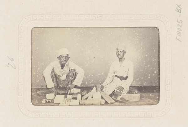 Editor: This photograph, "Untitled (four tailors)" by Willoughby Wallace Hooper, captures a quiet scene. I'm struck by the composition, particularly the textures of the clothing and the way the light falls. What do you see in this piece from a formal perspective? Curator: The composition relies heavily on geometric structure, doesn't it? Observe how Hooper uses the repetition of the turbans to create a rhythm, balanced by the contrasting textures of the garments. The interplay of light and shadow emphasizes the materiality of the scene. Editor: So, you're focusing on the visual elements first, rather than the narrative? Curator: Precisely. The formal elements constitute the essence of the work. Ask yourself: How does the artist's manipulation of these elements contribute to the overall aesthetic experience? Editor: That's a great way to approach it. I'll definitely pay more attention to those details now. Curator: Indeed. Considering form allows us to appreciate the artwork's intrinsic qualities, independent of external narratives.