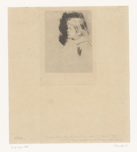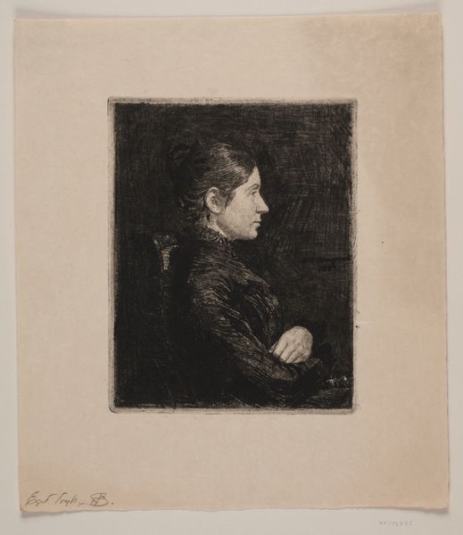 Curator: Here at the Rijksmuseum, we have an etching by Auguste Danse entitled "Zieke dame in bed," or "Sick lady in bed," from 1883. What strikes you first about it? Editor: The texture. It’s immediately tactile; I want to know how the artist manipulated the etching tools to get that soft, almost fuzzy quality in the shadows and the woman's dress. It feels quite intimate. Curator: The intimate scale certainly draws you in. Considering the date, this image speaks volumes about the socio-political landscape surrounding illness, particularly for women. It’s a very vulnerable portrayal. Editor: Absolutely. Etching as a medium, given its association with printmaking, allows for reproduction and distribution. Was this image intended for public consumption or more as a private study, perhaps? It's difficult to imagine this kind of starkness making its way into the salon. Curator: Well, Danse moved within Realist and Academic circles. Genre painting such as this was used as an accessible art, making use of realism to portray social realism themes. Editor: It makes me think about the materials involved. What kind of paper was used, and where was it sourced? Was the copper plate locally produced or imported? The materiality here shapes the final piece and tells a story about the art world's supply chains at the time. Curator: Those are crucial questions, reminding us that even what seems like a simple portrait carries the weight of economic and material realities. I agree that this work serves not only as an aesthetic statement but also a historical document, reflecting on themes of gender and health. Editor: Exactly! The choice to depict illness is also meaningful. It challenges the romanticization of suffering that was prevalent in some artistic circles. Danse gives us a raw, unidealized view of sickness, made more potent by the inherent reproducibility of the etching process. Curator: By focusing on the social implications and the impact of reproduction techniques, we see how art truly is interwoven with society at large. Editor: And by examining the means of production, the tools and the materials, we start to understand art's connection with everyday realities. There's a lot packed into this small etching.