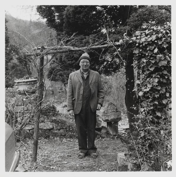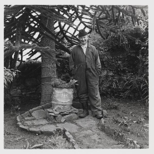 Editor: This photograph, "Gardeners" by Keith Arnatt, is quite intriguing. The man's stiff pose and the oddly placed "Coppers" sign create a rather unsettling mood. How do you interpret this work? Curator: Well, considering Arnatt's interest in subverting traditional photographic practices, I'd say this piece challenges the romanticized image of the gardener. The man is ordinary, even a bit awkward. This subversion raises questions about the social construction of labor and the idealized representations we often see. Editor: So, it's less about gardening itself and more about our expectations of it? Curator: Precisely. Arnatt makes us consider the cultural narratives we project onto these roles. It's a statement on the politics of representation, isn't it? Editor: That's fascinating! I hadn't considered the social commentary aspect. Curator: Art often challenges our preconceptions and makes us think about the world around us in a new light.