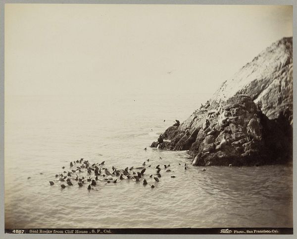 Curator: This is Carleton Watkins' gelatin silver print, "Seal Rocks," created between 1868 and 1869. The scene before us captures a cluster of rocky outcroppings emerging from the sea, now held in the collection of the Metropolitan Museum. Editor: My immediate response is one of stark simplicity, perhaps a hint of romantic loneliness. The monochromatic tones really strip the scene to its core elements – rock, water, sky. It is all so neatly ordered. Curator: I am drawn to the composition. The arrangement of these geological forms, particularly the way their peaks ascend in an almost pyramid-like fashion, demonstrates an awareness of classical structure. Also the photograph invites consideration of man's place within the vastness of nature, resonating with ideas that fueled the Hudson River School movement. Editor: Exactly, and Watkins made this photograph as part of his larger project to document the American West. His work shaped perceptions of the land during a time of immense social and economic change fueled by western expansion, so these landscape photos had an almost political meaning when considering ideas like manifest destiny. Watkins offered an almost mythic perspective for viewers who couldn't venture westward themselves. Curator: Looking at the subtleties in the gelatin silver print, one notices how Watkins manages to capture the varied textures, from the roughness of the rocks to the fluid, almost cottony appearance of the water. Editor: The long exposure used to capture this level of detail lends the ocean that dreamy quality. By distributing and displaying photos such as "Seal Rocks", Watkins democratized landscape in the 19th century by capturing majestic scenes like these, making them available in private homes as consumer items, bringing western vistas from San Francisco into any Victorian parlor. Curator: Precisely. The careful calibration of light and shadow emphasizes form, almost revealing the elemental geometric nature inherent within the chaos of the natural world. This tension brings such depth to it. Editor: It also suggests how the very act of image-making can alter perceptions of a subject, whether natural or human. Food for thought regarding the camera and its influence on 19th-century audiences and even us today, wouldn’t you agree?