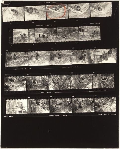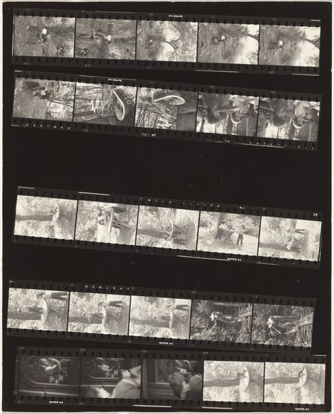 Curator: Here we have a contact sheet from Robert Frank, dating to 1954. The photographs are labeled "Mary in black coat--New York City no number." Frank is celebrated for his raw, unflinching look at American society. What are your initial impressions? Editor: There's a vulnerability to it, isn't there? It's rough, unpolished, with these little glimpses of the woman's face caught between frames, giving it a stuttering kind of rhythm. The strong blacks and stark whites lend it a kind of anxiety. Curator: Frank aimed to capture the everyday. These sheets give insight into his shooting process, revealing what he chooses to omit, which speaks to the socio-cultural context he provides for the observer. Do you see a narrative thread, a story he wants to convey in this arrangement? Editor: The way these frames play off of one another suggests he's deliberately composing with light and shadow. I see the visual contrast within the strip, and wonder if it represents how the dark shadows on one part of the face juxtapose a softer aspect of her expression. How that affects us visually. Curator: Many view Frank’s images as stark critiques of the American Dream, but by observing these candid moments, one might glean an intimate portrayal, maybe challenging conventional societal norms? Editor: What strikes me are the deliberate, almost cinematic choices within such a simple composition. Frank used stark contrast and high grain to give these pictures more bite. Curator: Frank presented this not just as personal narrative but social commentary, making us confront the real. Editor: Indeed. Through visual rhythm, light, and focus, Robert Frank directs us towards an emotional understanding. Curator: A poignant glimpse of Frank’s lens on the American identity. Editor: And how he saw light in black and white.