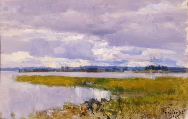 Pierre-Auguste Renoir created this painting, Marine, using oil on canvas, resulting in a textured surface. The composition is structured horizontally, dividing the canvas into bands of earth, sea, and sky. Notice the subdued palette of soft blues, greens, and earthy oranges, which creates a tranquil atmosphere. Renoir applied loose brushstrokes, blurring the lines between elements and inviting the viewer to perceive the scene as an impression rather than a detailed depiction. This technique aligns with the impressionist goal of capturing fleeting moments and the subjective experience of seeing. The artwork challenges the traditional landscape painting. It destabilizes fixed meanings and engages with new ways of thinking about space and perception. Renoir’s emphasis on light, color, and movement reflects a broader artistic concern with capturing the essence of a scene rather than its literal representation.