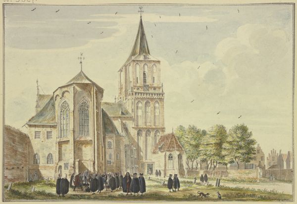 Curator: Let’s discuss Johannes Huibert Prins's "Schleusentor bei einer Kirche, links eine verschleierte Dame, ein Offizier und eine Dame mit einem Knaben"—or "Lock Gate Near a Church, with a Veiled Lady, an Officer, and a Lady with a Boy"—a cityscape executed in gouache, watercolor, and colored pencil. Editor: Immediately, I notice the sheer amount of activity captured in this rendering. The buildings give way to bustling workers at a canal. The drawbridge suggests a nexus of exchange, while figures in the foreground carry baskets and goods. It all emphasizes labor. Curator: Precisely. Prins's work gives us a glimpse into Dutch society during the 18th century. Note how the veiled woman contrasts with the working-class figures—suggesting a complex stratification of Dutch society at that time. What are your thoughts on the figures gathered by the waterway? Editor: It seems that it's the wealthier citizens who gather on the banks for leisure while a single working-class woman rushes over the bridge carrying a basket. These divisions of labor, and even leisure, solidify those social stratifications you mentioned, giving form to identity. Curator: Looking closely, we can identify signifiers of gender at play, and note the hierarchies inherent in the arrangement of figures; The officer in his regalia is clearly marked apart from the anonymous toiling workers behind him. Editor: Yes, the costuming speaks volumes. Even in this idyllic scene, there’s an emphasis on the mechanisms of social division. The textures of labor and class distinction are materially present, informing our understanding. Curator: In the landscape itself, the church stands as a stable edifice against the movements of everyday life; but note how Prins situates it at a slightly awkward, tilted angle. Do you think there's some disruption of tradition at play? Editor: Perhaps Prins subtly questioned the power of the church. Or maybe it was purely pragmatic, focusing on capturing the visual accuracy of this gate within the social contexts. It’s about the production of an image reflecting, or even shaping, society. Curator: In either case, it makes the familiar, suddenly unfamiliar. Editor: And by drawing attention to material conditions of the people there. Well, considering it from both ends is very fruitful. Thanks!