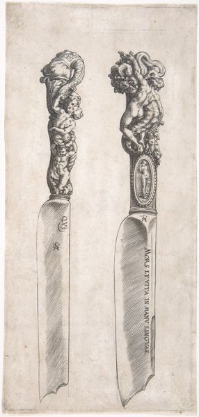 Curator: Let’s turn our attention to this intriguing print: "Design for Two Knife Handles" by Cherubino Alberti, dating back to the Renaissance, between 1553 and 1615. It’s currently housed at the Metropolitan Museum of Art. Editor: Wow, those are not your grandma's butter knives! I'm immediately struck by the contrast – one feels quite regal, almost stoic, with the eagle, while the other…well, he’s got some serious gut issues judging by the inscription. Curator: Yes, both handles are richly ornamented. Focusing on their manufacture, the prints give us an insight into the Renaissance fascination with elaborate table settings and the social rituals around dining. The materials themselves, likely metal for actual use, underscore a confluence of artistry and utility. We can imagine the level of craftsmanship and labor involved in bringing these designs to life. Editor: You’re right; there is definitely a story being told. Imagine holding one of these... feels more like brandishing a miniature sculpture than cutting a loaf of bread! And Alberti captures the personalities so well, the almost haughty bird on one, and the fleshy, indulgent chap on the other… there's a humor there, isn't there? A sort of dark wit about appetite and social status. Curator: Absolutely. And consider how prints such as this facilitated the spread of such designs, democratizing access to high-end aesthetics and potentially inspiring various levels of imitation in different workshops. The engraving as a reproducible medium made aspirational design available beyond the wealthiest echelons of society. Editor: It’s fascinating how even something as functional as a knife handle could be a site for expressing complex ideas and social commentaries! Curator: Indeed, it reframes our understanding of design and consumption within Renaissance society, moving beyond aesthetics to highlight the interconnectedness of material culture and social dynamics. Editor: Looking at them together, I wonder if they're also hinting at some moral lesson, maybe temperance versus gluttony? It all seems a little much for just serving up dinner! Curator: Perhaps... In all, it underscores the cultural and economic investment in even seemingly small, decorative items, reflecting the Renaissance emphasis on humanist values and refined living. Editor: I find I see them differently now—I started off with only considering aesthetic impressions, and now, wow, what a dense concentration of craft, class, and cheeky artistic judgment!
