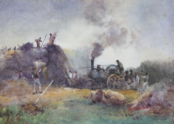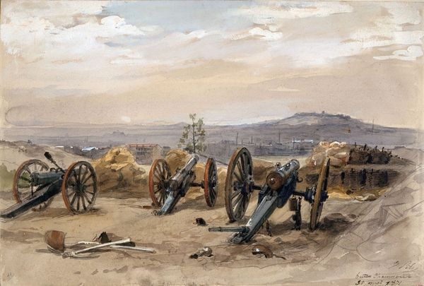 Editor: This is "The Dream," an oil painting created in 1888 by Jean-Baptiste Édouard Detaille. Looking at the exhausted soldiers and the ghostly army looming above, it evokes such a strong feeling of... weary hope, maybe? What do you see in this piece? Curator: Weary hope – that’s beautifully put! For me, this painting is all about the power of shared dreams in the face of hardship. See how Detaille contrasts the grounded reality of the sleeping soldiers with the ethereal vision above? They dream of a triumphant, unified force, fueled by the idea of victory, even as their bodies rest in what looks like defeat or exhaustion. Editor: That makes so much sense! The soldiers almost seem to be drawing energy from the dream army. But what about the line of rifles stacked along the horizon? It seems so stark. Curator: Ah, yes, those are stacked arms, a visual reminder of duty but also of vulnerability. They mark the edge of the conscious world and the border into dreams, almost a bridge into that other reality of potential triumph. Consider the lone dog as well – faithful, watchful, ever-present hope perhaps? It all makes you wonder: is the dream sustaining them, or is the reality crushing them? Editor: It’s such a poignant way to explore themes of war and the human spirit. Do you think the artist meant it to be more uplifting or melancholic? Curator: That’s the beautiful ambiguity, isn’t it? I suspect Detaille wanted us to grapple with both. To acknowledge the harshness of their reality, while still recognizing the incredible resilience and hope that resides within. Editor: This has totally changed how I see the painting! I came in with a simplistic view of weary hope and the reality, and now it feels far more nuanced. Thank you. Curator: And thank you! That “weary hope” sparked something new in me too. Isn't that the delightful thing about art—it never stops shifting and surprising us?