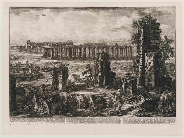 Curator: I’m struck immediately by the sheer industriousness depicted here. It feels like a construction site frozen in time, despite the decay. Editor: Indeed. We’re looking at "General View," a 1778 etching by Giovanni Battista Piranesi, currently residing at the Minneapolis Institute of Art. The artwork embodies Neoclassical fascination with antiquity. Curator: The scale is incredible, and the detail Piranesi achieves with etching is astonishing. You can practically feel the grit of the stone. But, to your point about industriousness, why populate the image with laborers dismantling this classical structure? Editor: Ah, there’s the crux of the matter. Piranesi wasn't merely documenting ancient ruins; he was making a statement about the transient nature of power and empire, and about the continual appropriation of the past. This romantic ruin exists on paper, it’s there to be studied but the image also points at an industry; he’s showing us the contemporary labor reshaping that history. The past isn’t pristine. Curator: So, by showing us the deconstruction, the quarrying, he’s implicating us, the viewers, in the ongoing cycle of consumption and destruction? What was made can also be unmade by material demand. Editor: Precisely. The architecture of power gets translated into labor, industry, and consumption through processes visible through printmaking, then dissemination. Print allows him to offer this vision to a wider audience to propagate a shared visual history, however flawed. Curator: The very act of creating and distributing this etching becomes a part of the process he depicts. Is Piranesi inviting critique on how art acts on the perception of monuments? The placement of workers give new context to history painting by asking "how does art serve labor" and who gets memorialized? Editor: Yes, he underscores the museum’s role as cultural arbiter. His print asks us to consider how and why we create history, as well as which versions of the past we amplify through art. It is not lost to me that he’s using an easily reproducible medium to comment on architecture in this way. Curator: Food for thought on who gets to create meaning in this world of stone and ink. It truly adds layers to viewing. Editor: It’s a remarkable piece, layering technical skill with incisive social commentary.