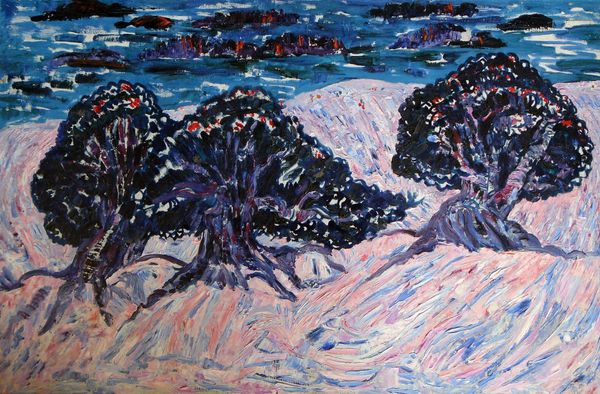 Editor: So, here we have Marsden Hartley’s "Landscape," a small but mighty oil on board. It feels almost aggressively textured, like he sculpted the paint. What do you make of it? Curator: It's like Hartley took pure emotion and translated it directly onto the canvas, wouldn't you agree? The vibrant, almost clashing colors create a sense of raw energy. It’s not a tranquil landscape, but one teeming with life, almost a reflection of the artist’s own turbulent inner world. Editor: I see what you mean about the turbulence. The brushstrokes are so distinct, not blended at all. Curator: Exactly! Each stroke is a separate thought, a separate feeling. It makes you wonder what landscape sparked such a vivid and complex reaction within him. I find it utterly compelling. Editor: It's definitely given me a new perspective on landscape painting. Curator: It has that effect, doesn't it?